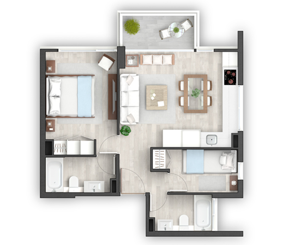BT1 (medidas corresponden al dpto. 314, 914, 1014) INTERIOR 47,51 m2 TERRAZAS 10,00 m2 SUPERFICIE ÚTIL 52,51 m2 SUPERFICIE TOTAL 57,51 m2 AGOTADO PLANTAS RELACIONADAS DEPARTAMENTAL II